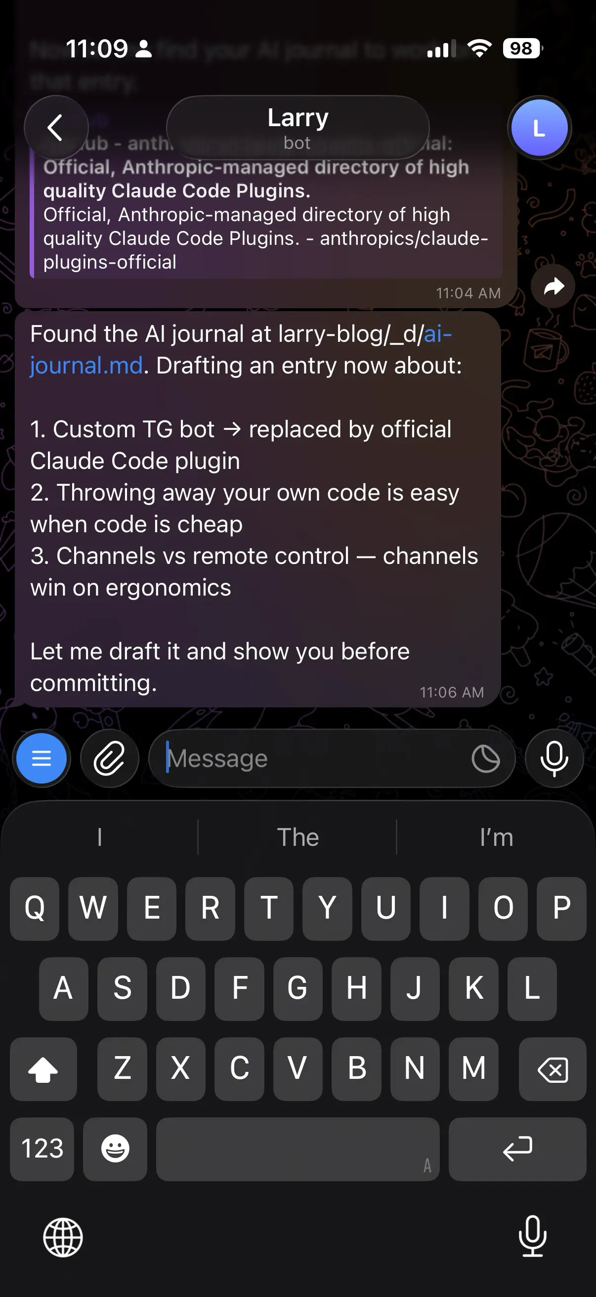 - Reflection: The speed of iteration was insane - from “This is a test” to analyzing my journal and generating commit messages in just one week. The addiction had begun.