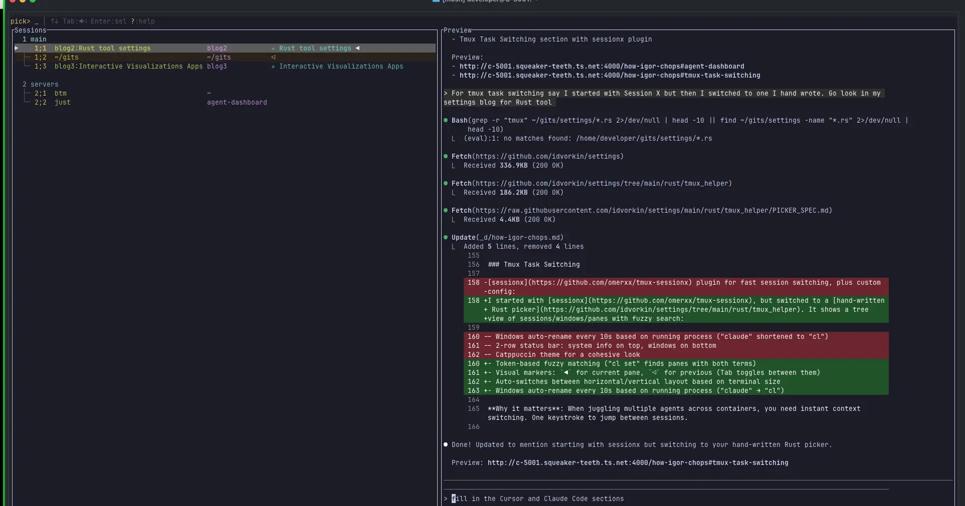 Tmux is the backbone of multi-agent work. I’ve built a hand-written Rust picker that’s hyper-optimized for me - down to the exact amount of space for window/pane titles so I can maximize the context I see.